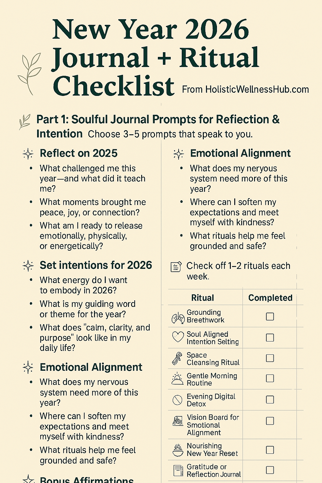 Download your New Year 2026 Journal + Ritual Checklist and start the year with gentle intention, emotional alignment, and soul‑nourishing rituals.