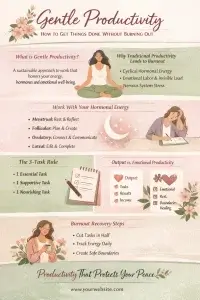 Gentle productivity offers a new paradigm — one that honors your energy, emotions, and hormonal rhythms. It’s not about doing less. It’s about doing what matters, in a way that doesn’t cost your well-being.