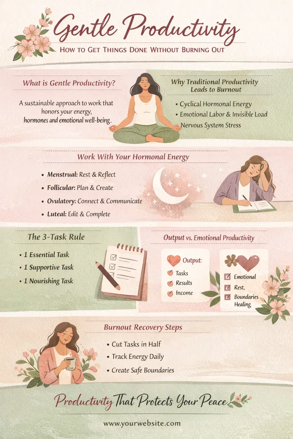 Gentle productivity is a sustainable approach to work that prioritizes energy, hormonal cycles, and emotional well-being over constant output.