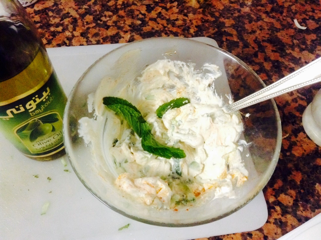 Labenah with shreds of cucumber and mint. A drizzle of olive oil and a pinch of chili powder. Spread it on Arabic bread. The taste is refreshing.